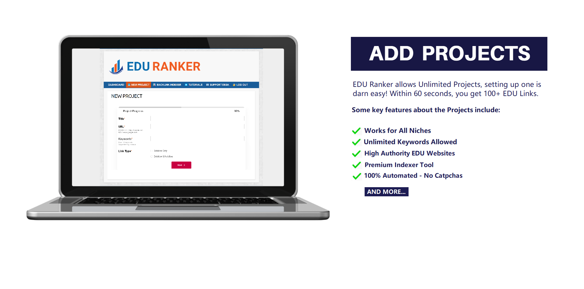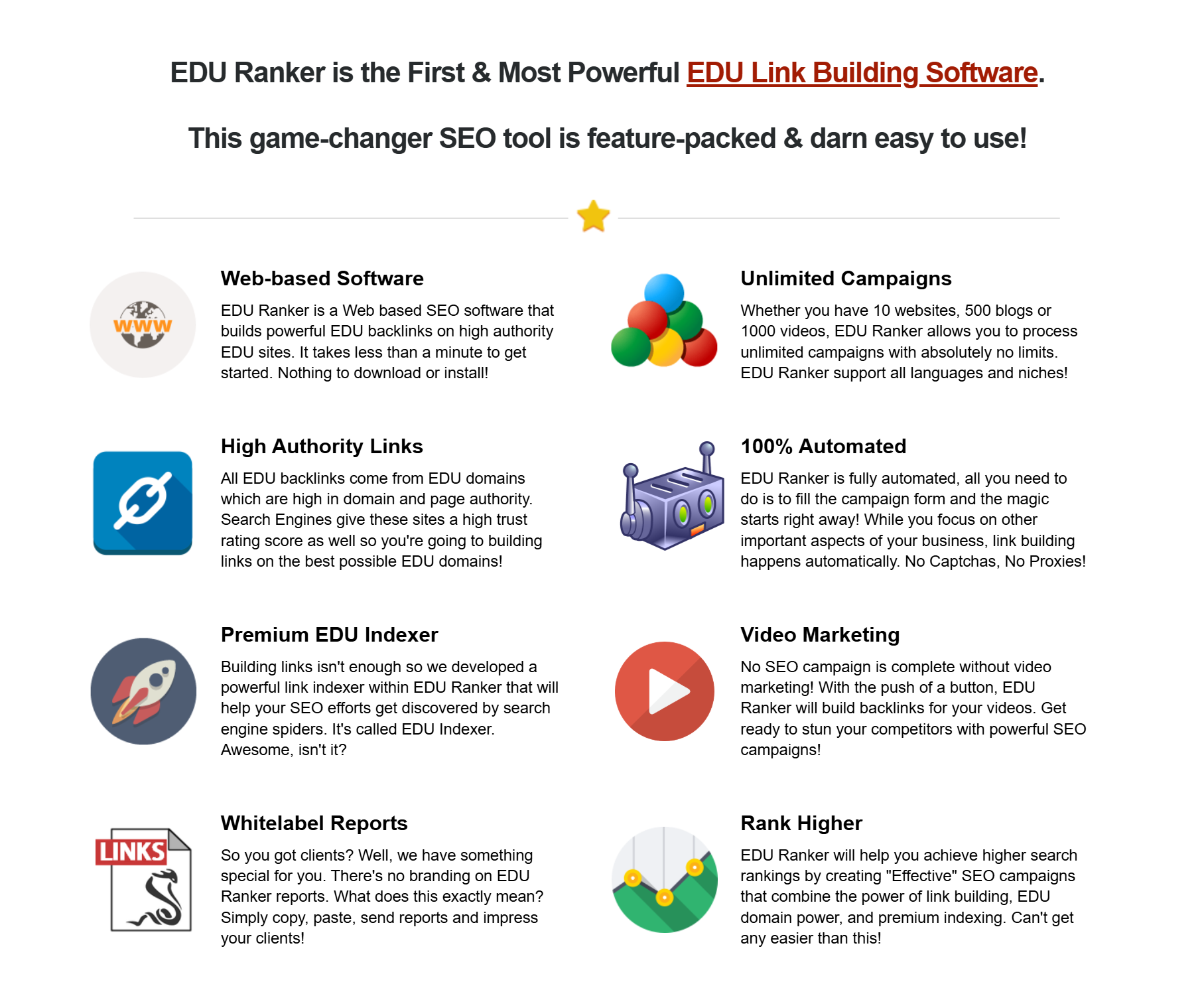 EDU Ranker is world's first web-based EDU link building software that help build 100s of high authority EDU links within minutes. All you need is a URL and few keywords to get started. It is a 100% automated tool!